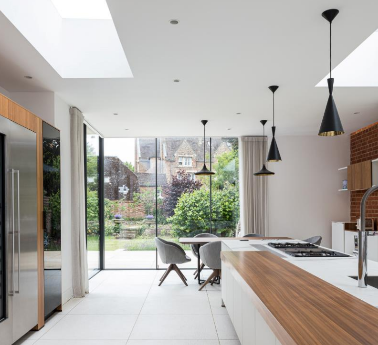 Many Oxford terraces have an unused alleyway running down one side of the house. Extending into this side return is a popular option that can add significant width to a kitchen without eating into the garden. Combined with a rear extension, it can create a generous open plan kitchen and dining space.